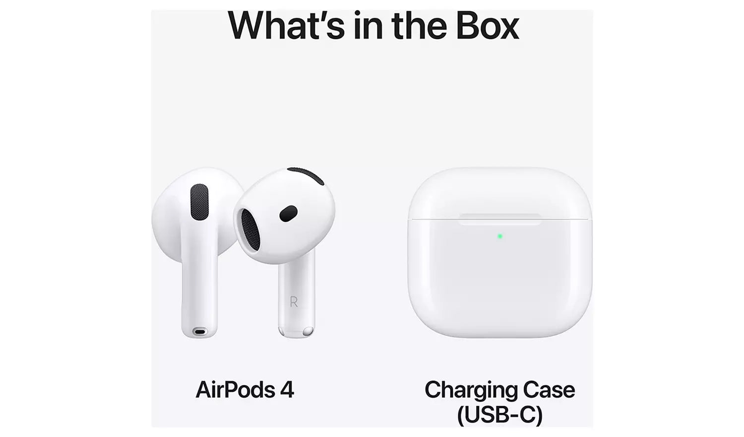 - Included: AirPods 4, USB-C Charging Case (no adaptor), documentation