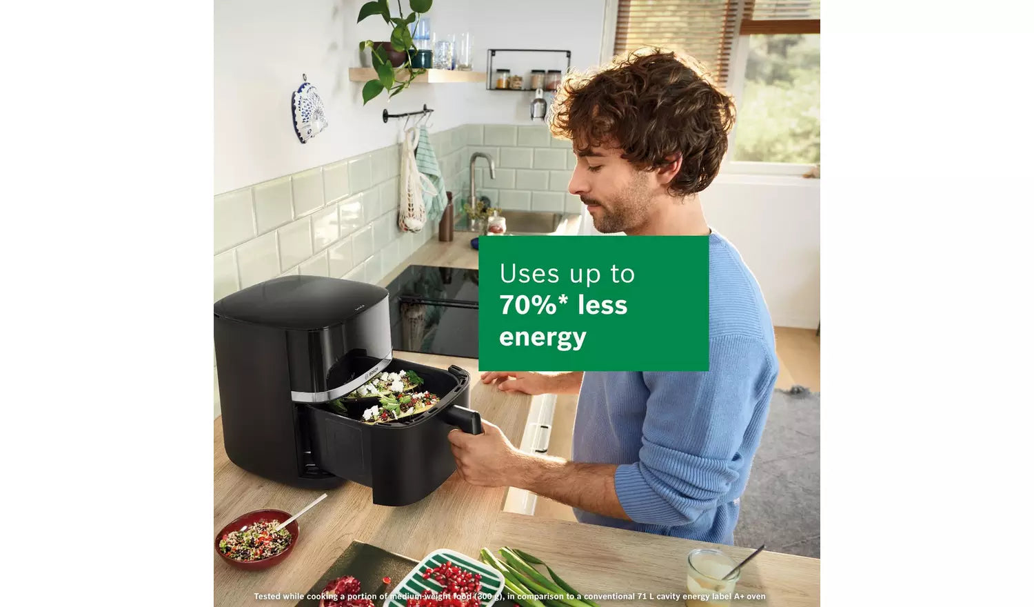 Cook up to 60% faster than a conventional oven and save up to 70% on energy. With no preheating required, this Bosch air fryer helps reduce cooking time and electricity usage, making it an efficient and eco-conscious choice for busy homes.