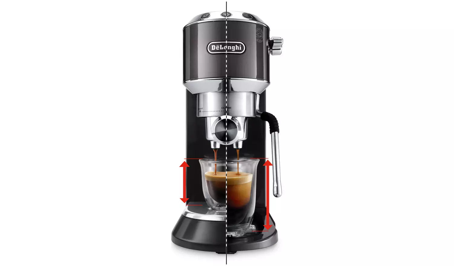 At just 14.9cm wide, this espresso machine fits effortlessly into compact kitchens while making a stylish statement. The adjustable cup stand accommodates mugs up to 10cm tall, the cup warmer keeps cups ready for serving, and the elegant grey finish adds a modern touch.