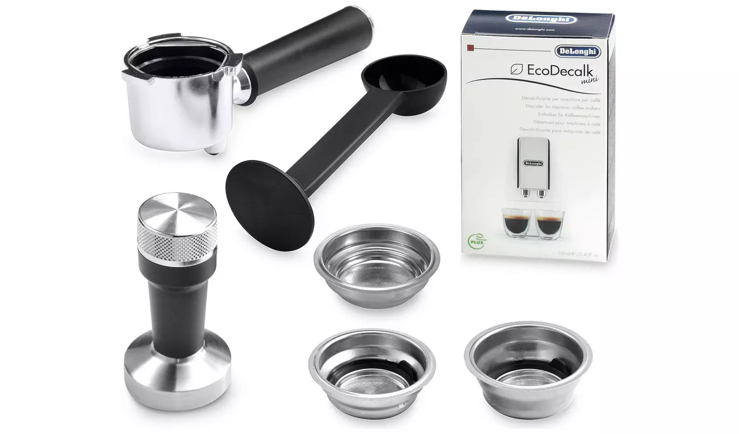 - Box Contents: Coffee machine, filter holder, 3 filter baskets, tamper, milk jug, barista kit, cleaning tool, descaler