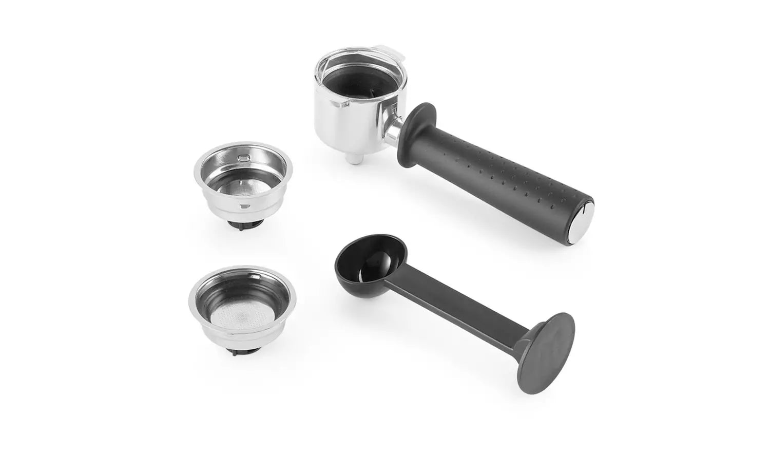 - Box Contents: Coffee machine, filter holder, 3 filters, measuring presser