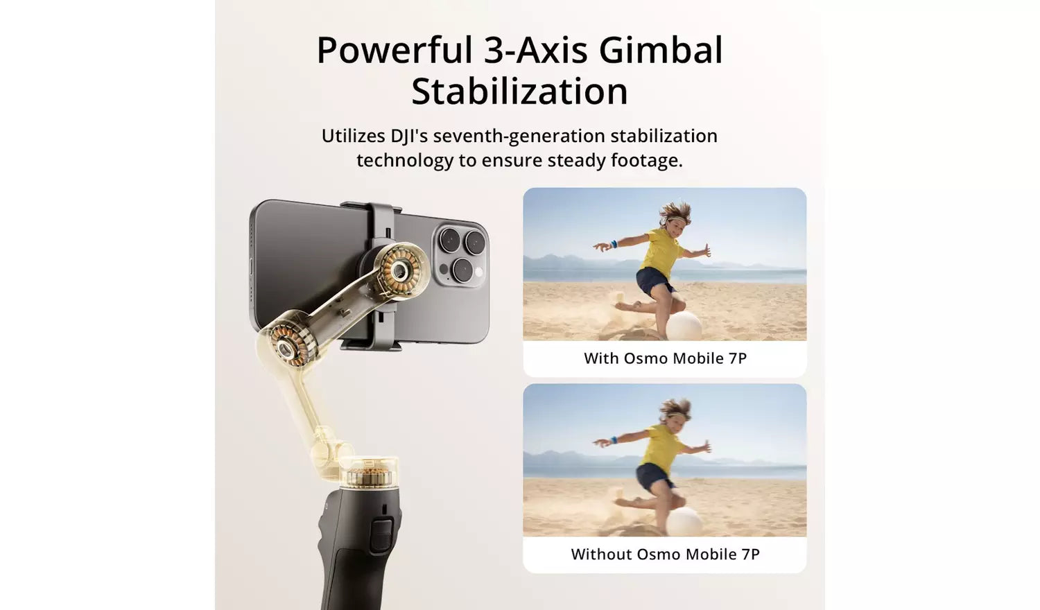 Powered by DJI’s seventh-generation three-axis stabilisation, the Osmo Mobile 7P delivers ultra-smooth video even when you are walking, panning, or filming fast-moving action. Intelligent motion compensation actively reduces shake in real time, helping your videos look polished and steady in any environment.