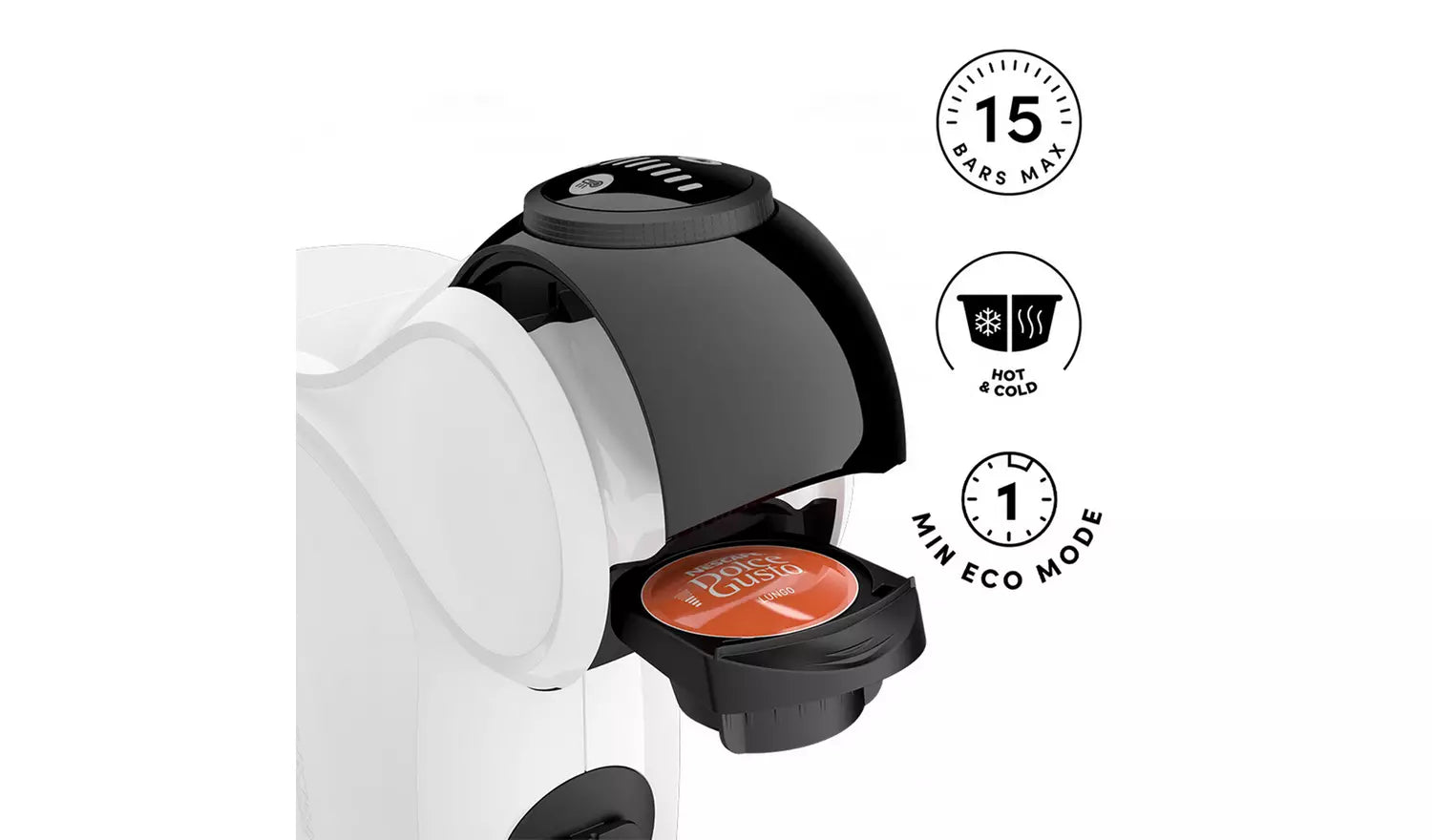 Styled in a modern white finish, the Genio S fits neatly into any kitchen space. Eco mode automatically switches the machine off after one minute, helping to reduce energy usage while maintaining an A rated efficiency for everyday use.
