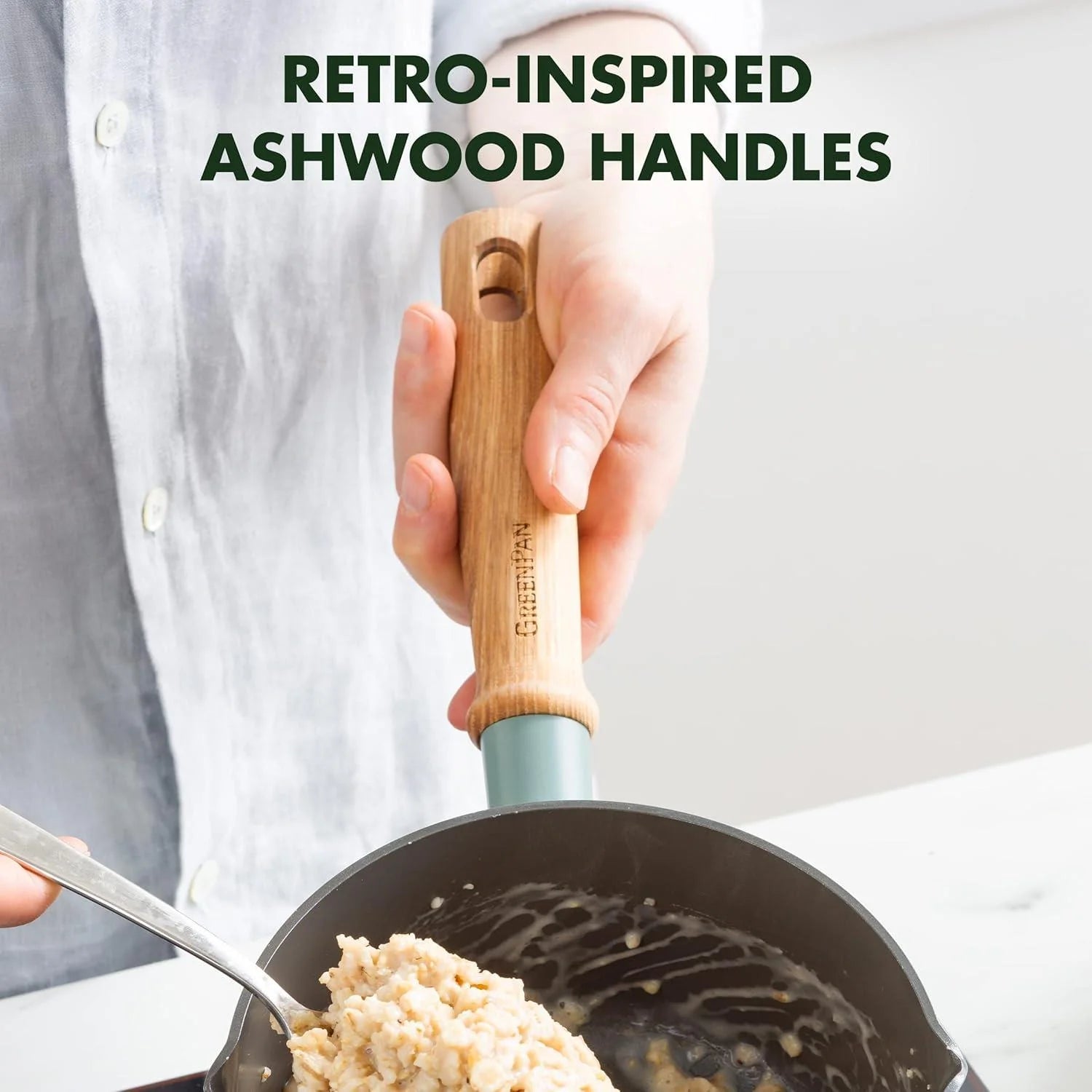 With its matte blue finish and ash wood handles, the GreenPan Mayflower Set combines form and function beautifully. Inspired by Scandinavian design, it brings a modern yet timeless look to your kitchen while reflecting a commitment to craftsmanship and sustainability.