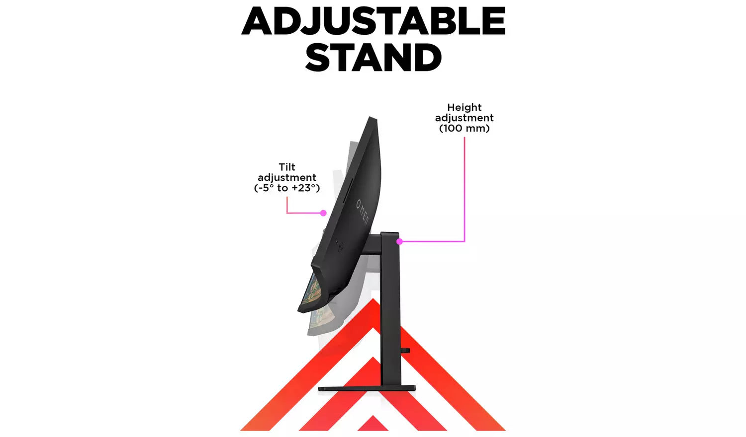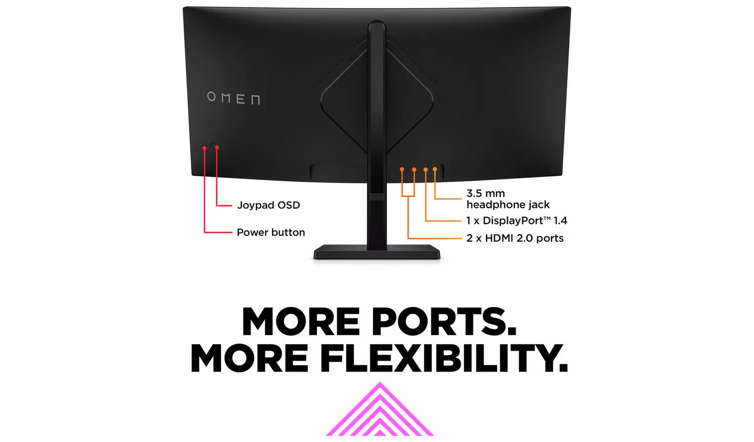 Equipped with dual HDMI ports and a DisplayPort input, the HP Omen 34c easily connects to gaming PCs, consoles, and streaming setups. Integrated 2 × 3W speakers offer crisp, convenient audio without needing extra peripherals. The display’s tiltable stand helps you find the ideal viewing angle, while VESA compatibility allows effortless wall mounting.