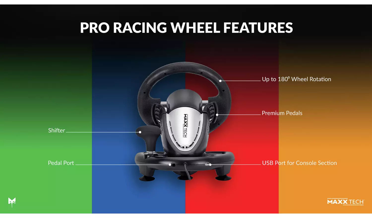 Feel every turn, drift, and acceleration with the Maxx Tech Pro Racing Wheel Kit. Built with a 180° rotation system and vibration motors for realistic feedback, this racing wheel captures the true spirit of motorsport. Its ergonomic design and grippy wheel surface ensure a firm, responsive feel—making every race feel like the real thing.