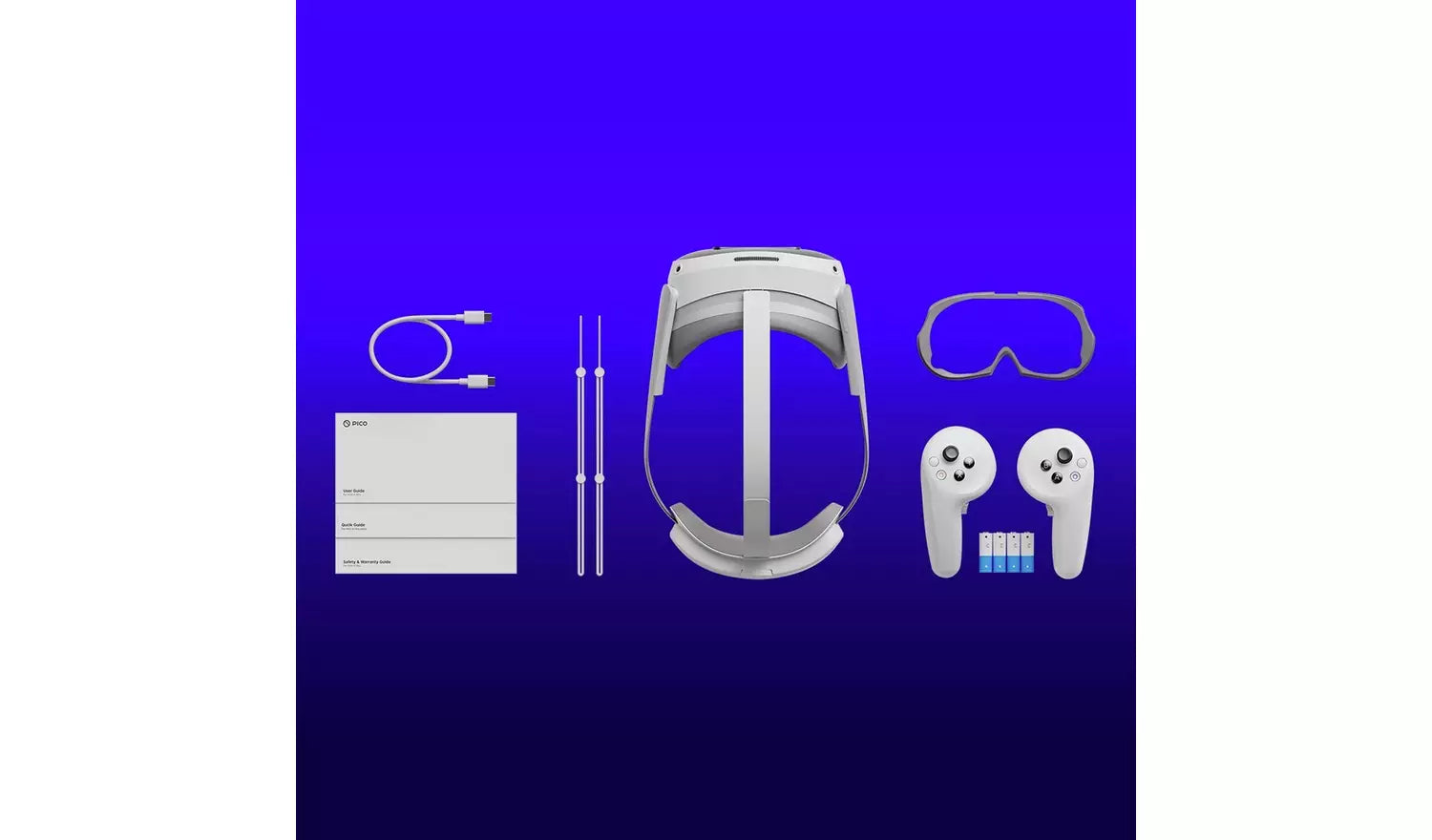 - Box Includes: PICO 4 Ultra Headset, 2 Controllers, 2 Wrist Straps, Glasses Spacer, Face Foam, 2 AA Batteries, USB-C to USB-C Cable, Quick Guide, User Guide, Safety & Warranty Guide