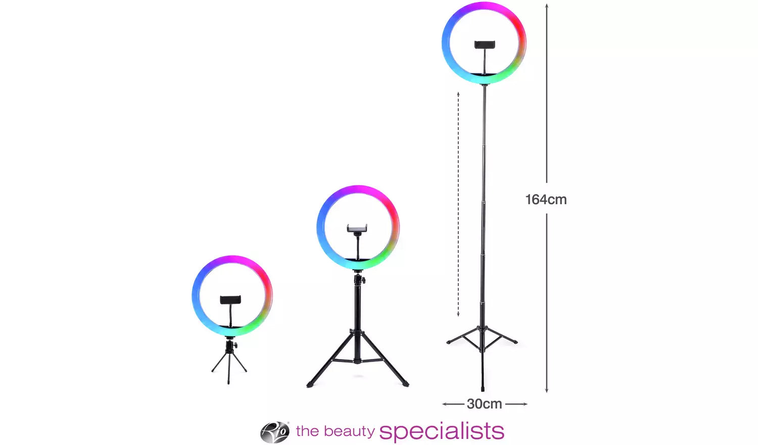 This large 12 inch RGB LED ring light delivers bright, even illumination using 160 white LEDs and 40 RGB lights. With a choice of over 50 colour options and three natural light settings, you can easily tailor the lighting to suit makeup application, video calls, streaming, or photography. The dimming range from 1 to 100 percent allows precise control for the perfect finish every time.