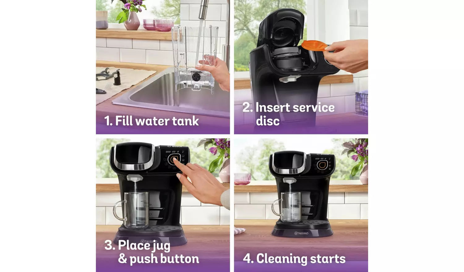 The integrated BRITA water filtration system improves flavour while helping to reduce limescale build-up, extending the life of your machine. With automatic cleaning and descaling alerts plus dishwasher-safe parts, maintaining your Tassimo My Way 2 is refreshingly easy.