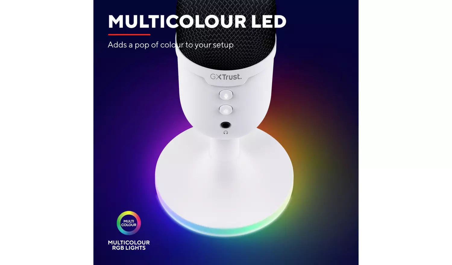 Add personality to your gaming space with vibrant multicolour RGB lighting that surrounds the base of the microphone. The clean white finish paired with subtle RGB glow delivers a modern aesthetic that looks just as good on camera as it does on your desk.