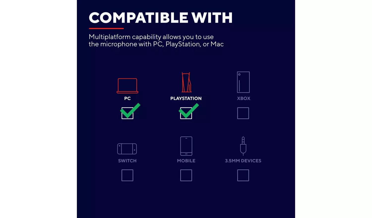 Get started instantly with simple USB plug-and-play connectivity. Compatible with PC, PlayStation and Mac, this gaming microphone lets you jump straight into streaming, recording or chatting with no drivers or complicated setup required.