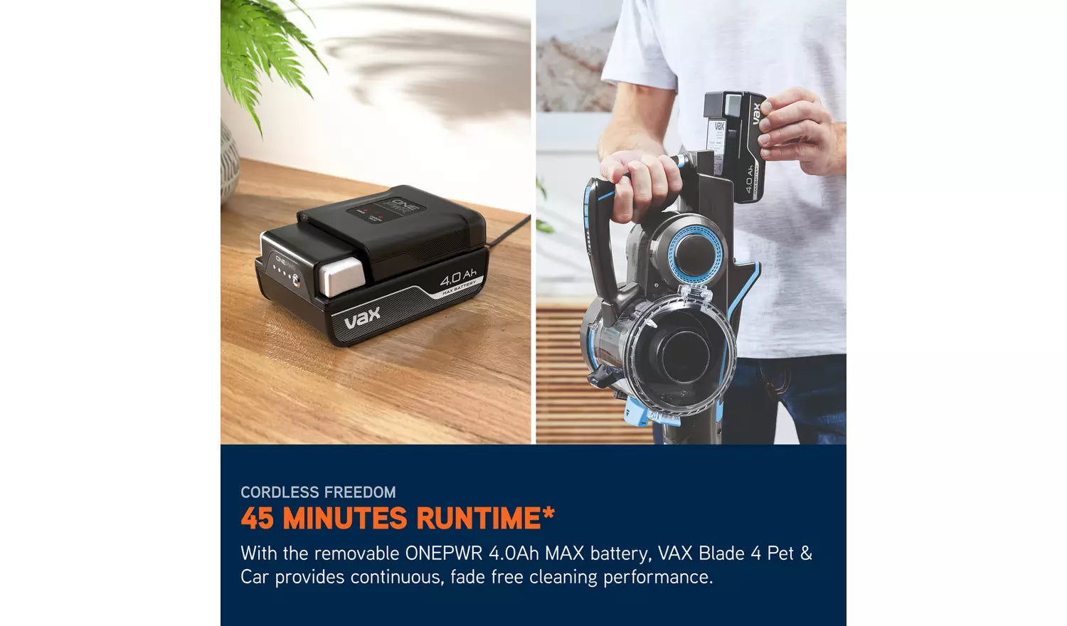 Powered by the removable ONEPWR 4.0Ah MAX battery, the Vax Blade 4 Classic offers up to 45 minutes of runtime, depending on the setting used. Enjoy continuous cleaning with fade-free performance, plus the flexibility to swap batteries across compatible Vax ONEPWR products.