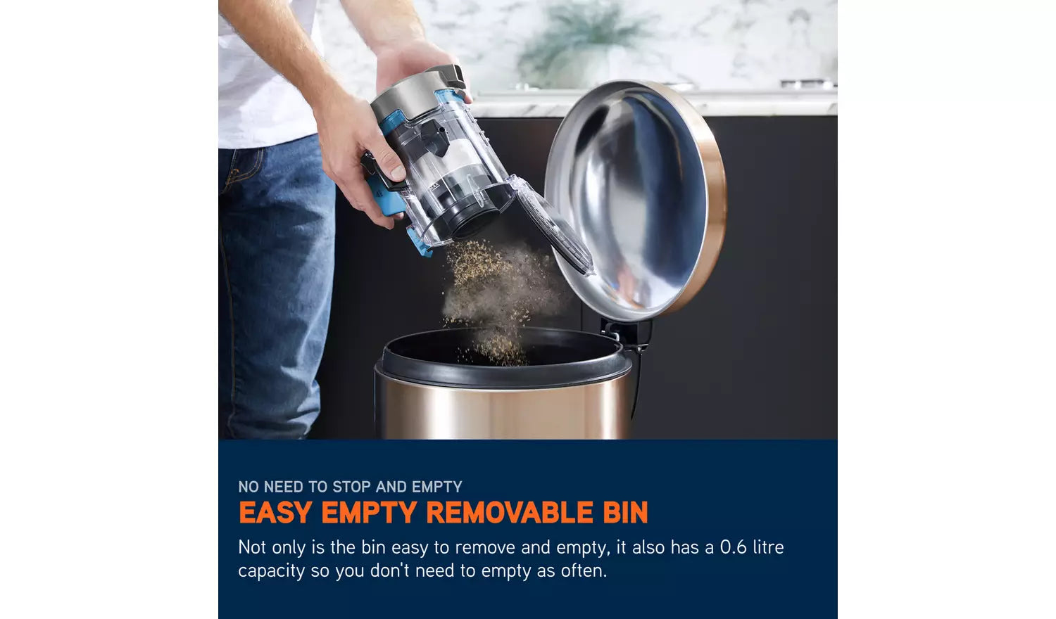 The easy-to-empty 0.6 litre dust bin means fewer trips to the bin, while the washable filter helps maintain strong suction over time. A low battery indicator keeps you informed, and the wall mount ensures neat, space-saving storage when not in use.